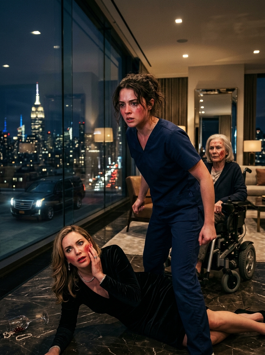 Her voice was shaking—but her body wasn’t. She stood planted between the wheelchair and the woman sprawled across the polished marble floor, her chest rising and falling too fast, adrenaline flooding everything.